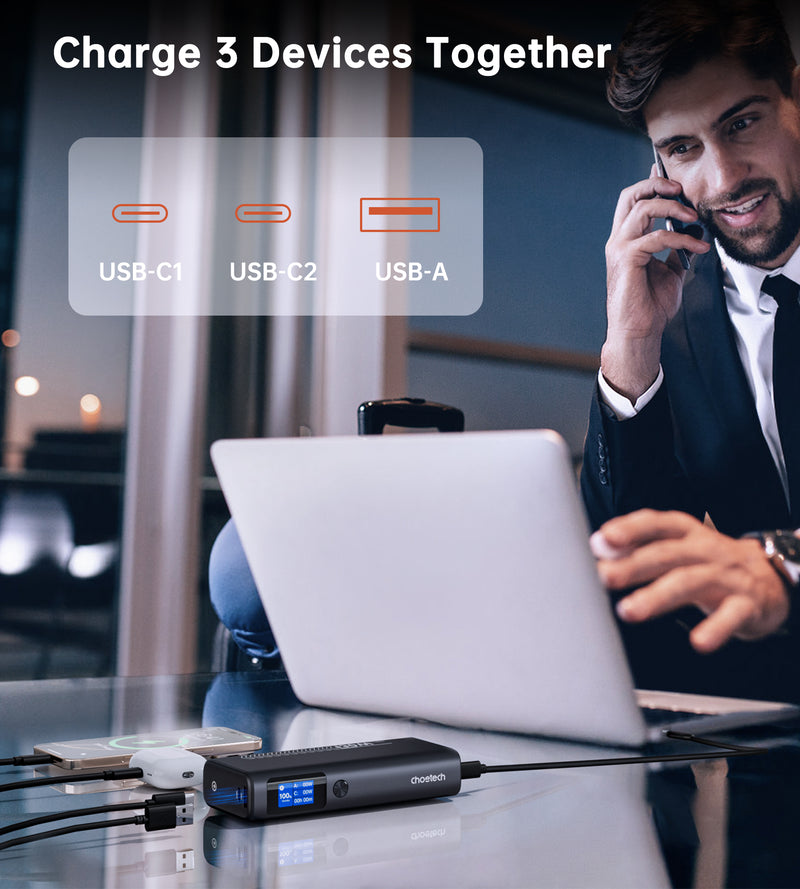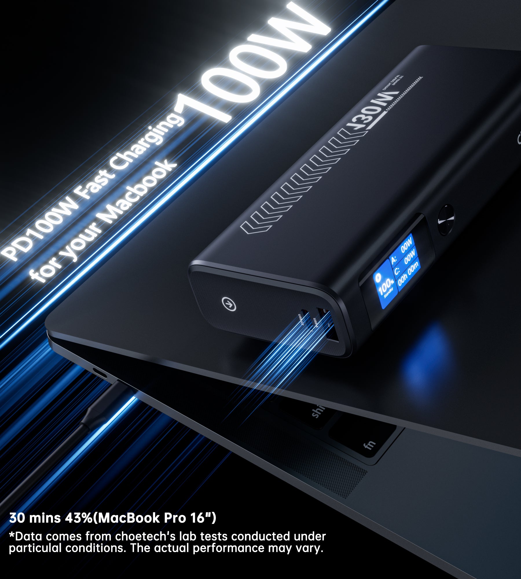 The Choetech 130W Portable Power Bank is built for high-performance users. Featuring up to 130W dual-port fast output, 20000mAh capacity, and a clear TFT display, it keeps your laptops, tablets, and phones powered — wherever your day takes you.