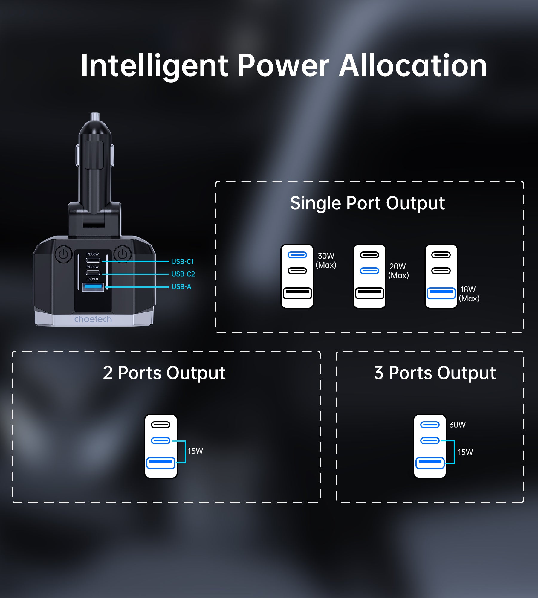 Input: DC12-24V/10A Output: USB-C1 :5V⎓ 3A,9V⎓3A,12V⎓2.5A (30W Max); PPS:3.3-11V⎓3A USB-C2:5V⎓3A,9V⎓2.22A,12V⎓1.67A (20W Max); USB-A:5V⎓3A,9V⎓2A,12V⎓1.5A (18W Max); USB-C2+USB-A:5V⎓ 3A Max; USB-C1+(USB-C2+USB-A):30W+15W (45W Max)