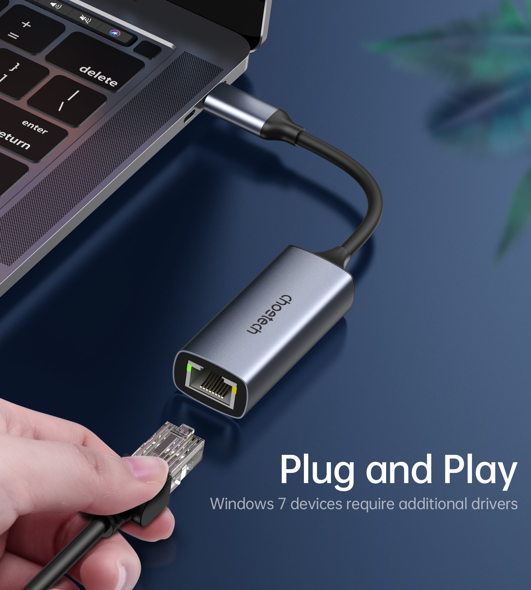 Plug-and-Play-Design des USB-Typ-C-zu-Ethernet-Adapters vereinfacht die Verbindung und verbessert die Effizienz. Der hochwertige RJ45-Netzwerkanschluss sorgt für eine enge Netzwerkkabelverbindung.