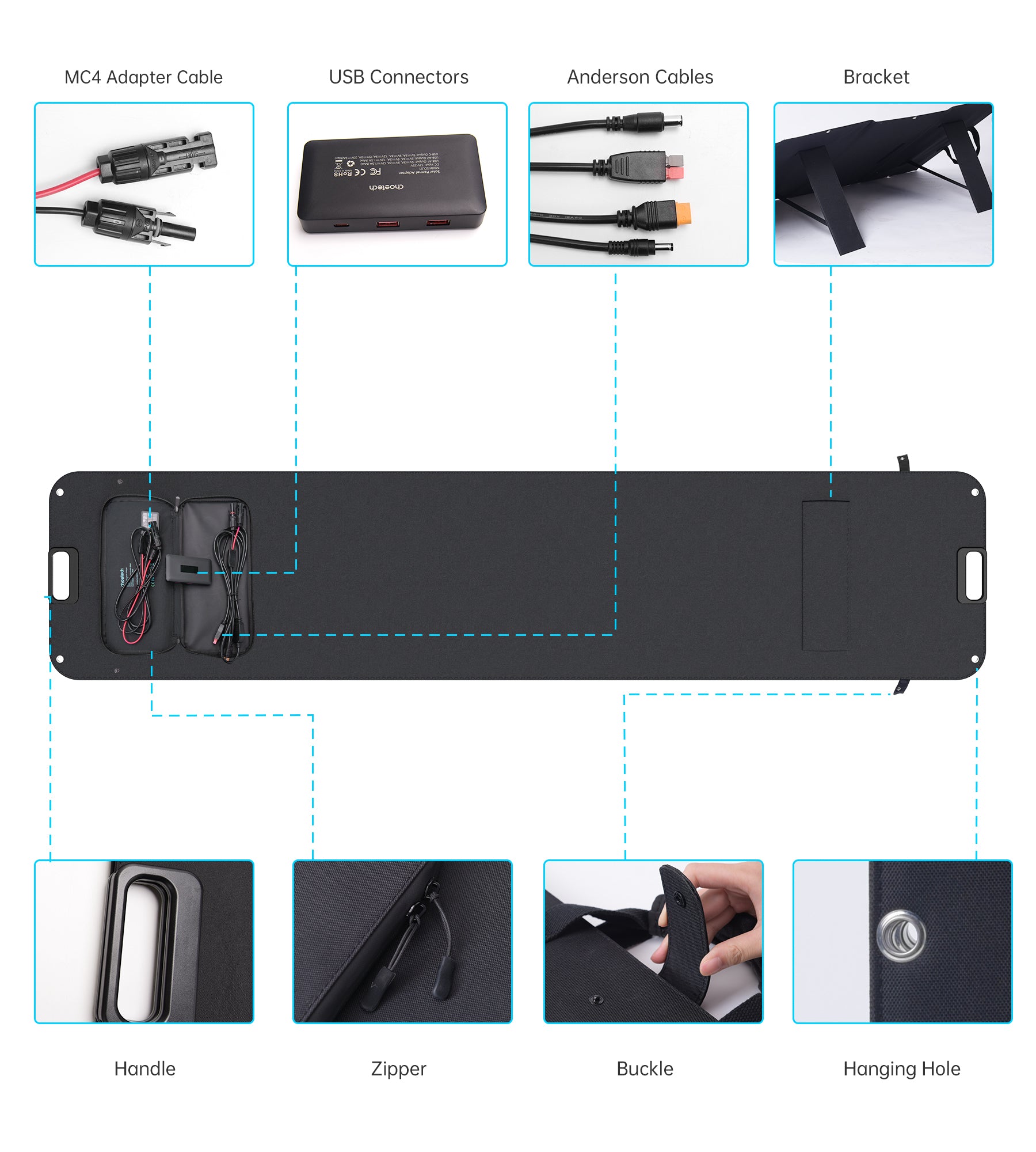 The panel includes high efficiency sun-powered cells which make the panel's surface relatively small in comparison to other similar 200W panels. Our panel is suitable if you are looking for a battery solution while you are out on your camping, RV tour or just enjoying outdoor activities with your friends for an extended period of time.