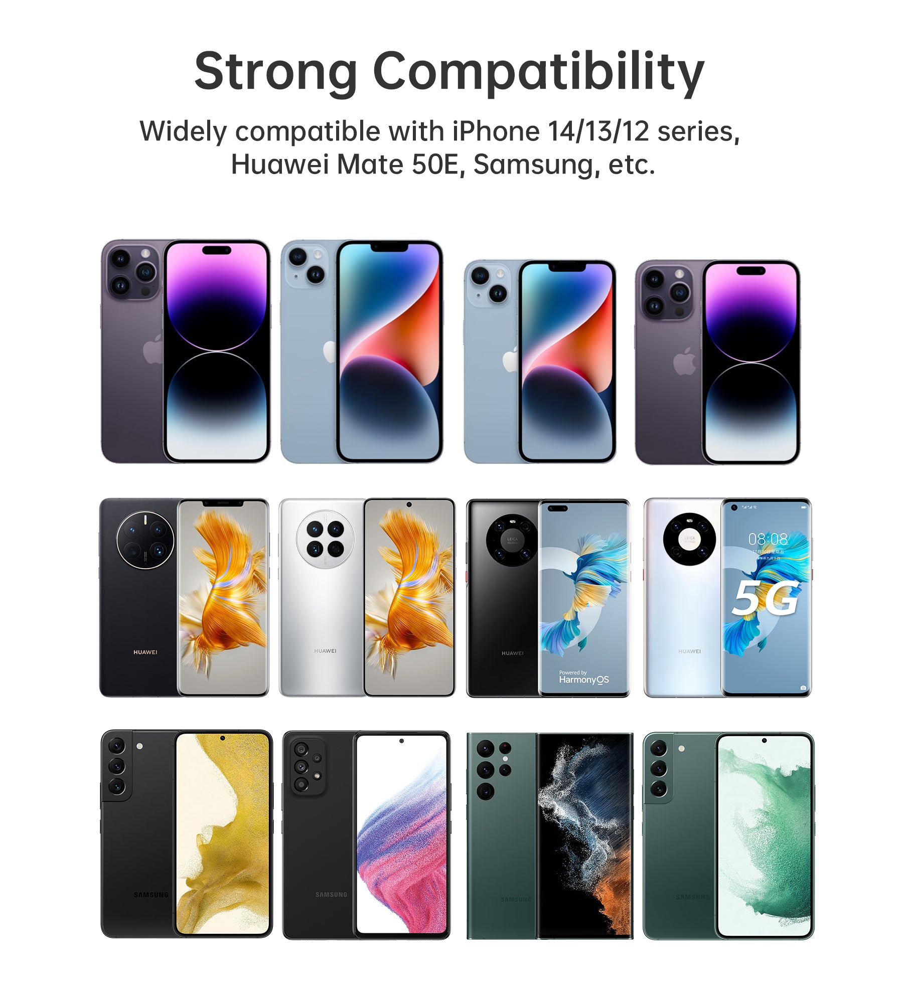This power bank delivers optimized charging to a wide variety of mobile devices, including phones, tablets and more - like the iPhone Series 12, 13 and 14, Huawei Mate 50E, Samsung Galaxy S21, S22, S23.