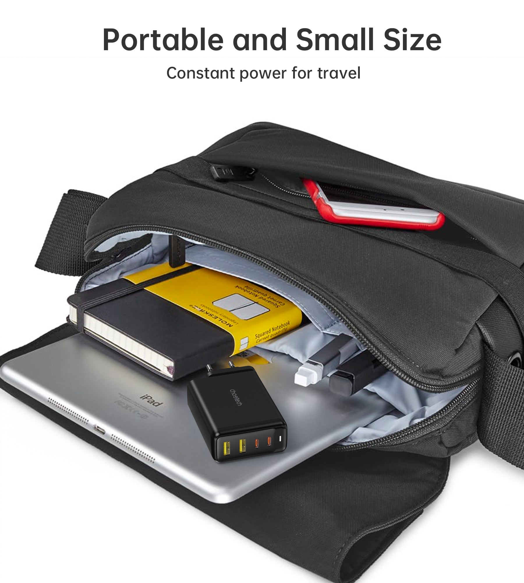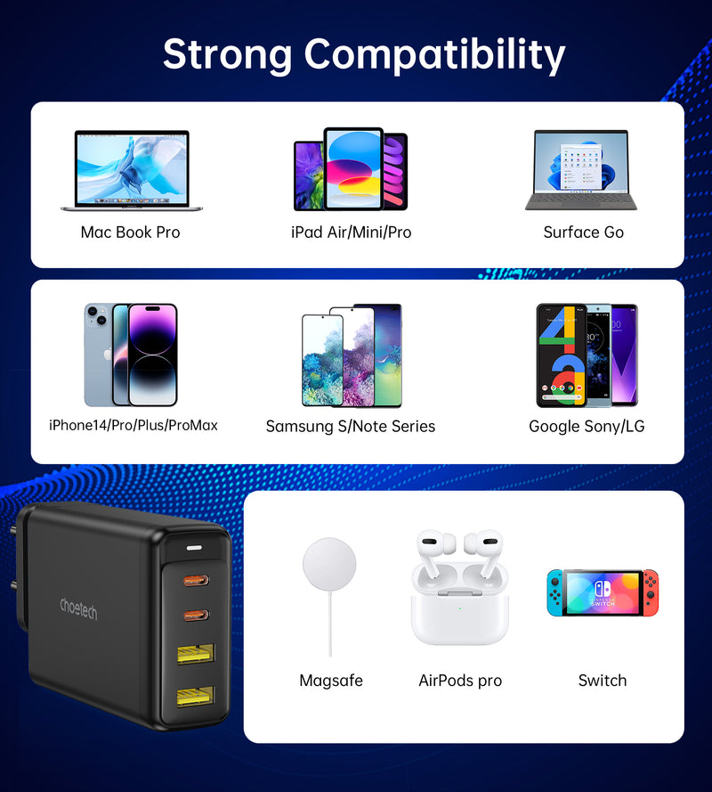 Choetech’s four port GaN Wall Charger delivers a maximum shared output of up to 140W to efficiently charge a MacBook Pro as well as three other additional devices through its two USB-C and two USB-A ports. Equipped with Intelligent Sharing Technology that allows our wall charger to recognize and distribute necessary output to four connected devices. Features integrated GaN technology for a safe and efficient high wattage charging experience - no other reliable four-port charger packs that kind of power into such a tiny size.