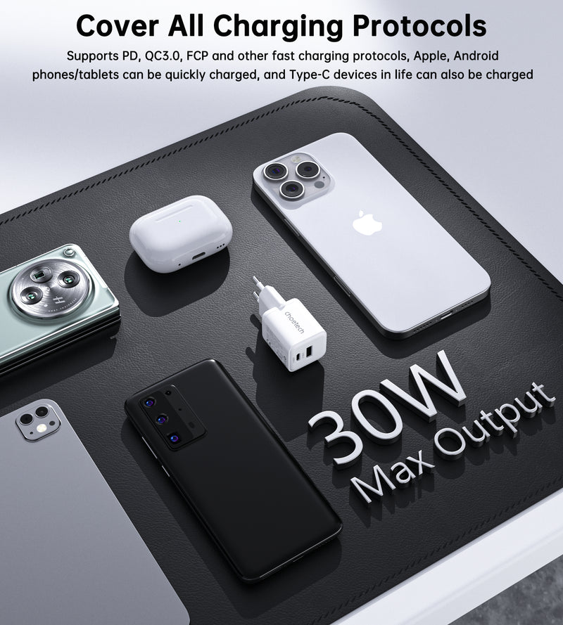 30W GaN USB-C & USB-A Charger – Dual Port, EU Plug