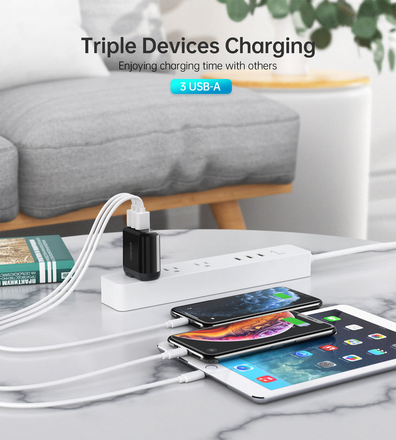 【17W 3 USB-Port USB Charger】 The triple-port usb wall charger is in premium performance. It has been upgraded into 3 ports, allowing to juice up 3 devices simultaneously with total current 5V/3.4A, single port up to 5V/2.4A max. Therefore, the USB wall plug is not only saving your time but also relieve you from burden of carrying charger.