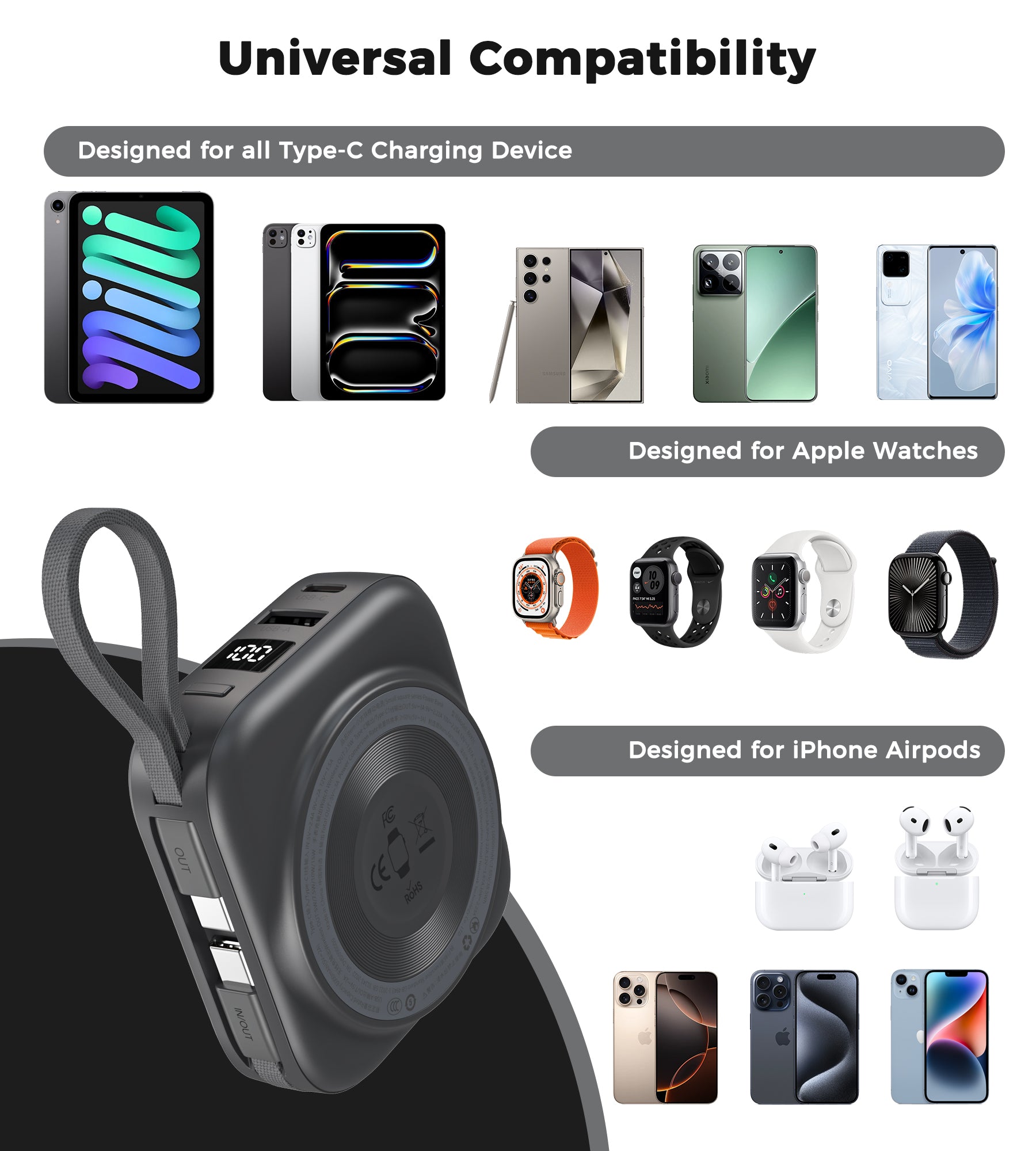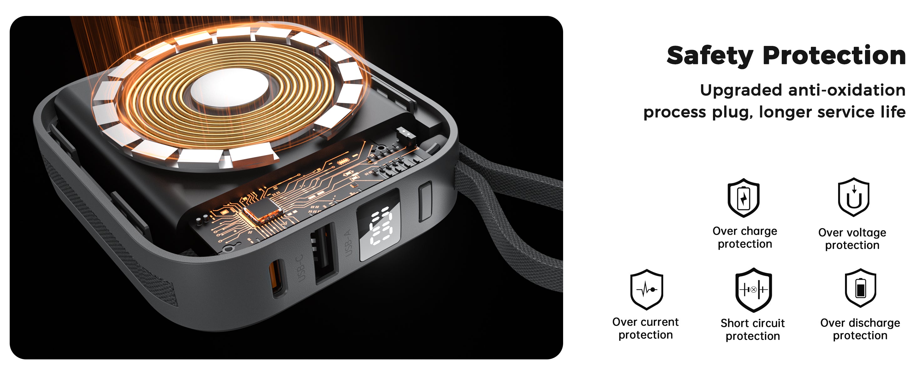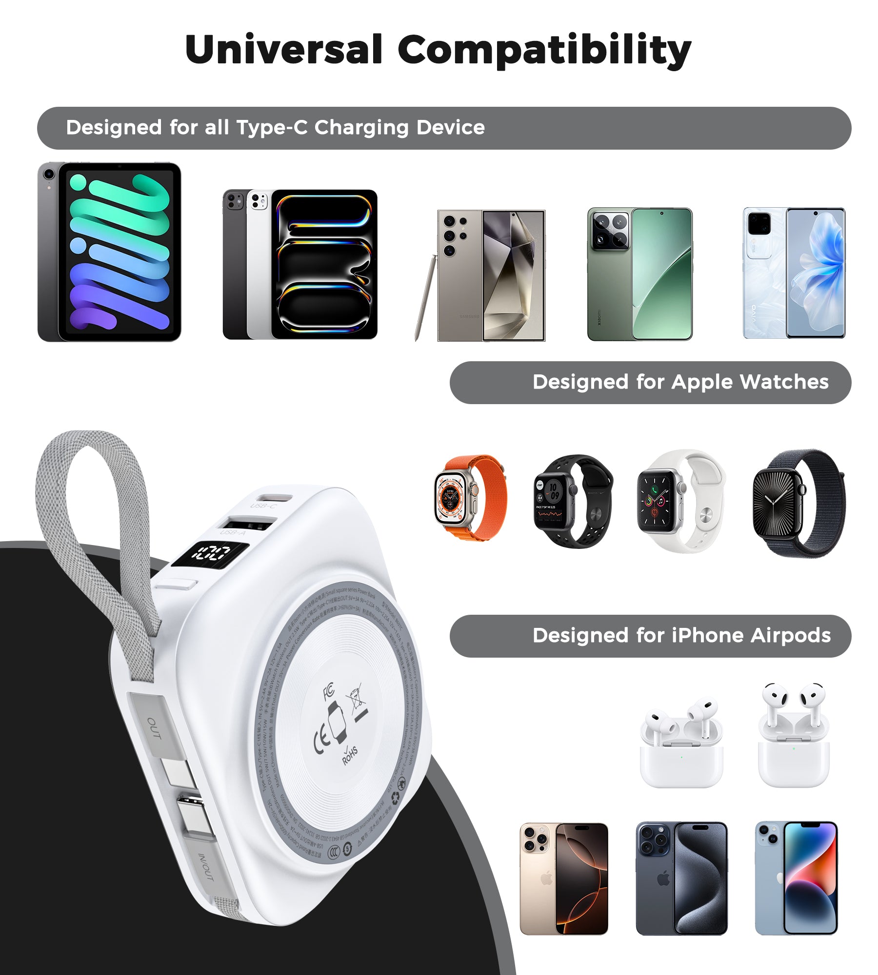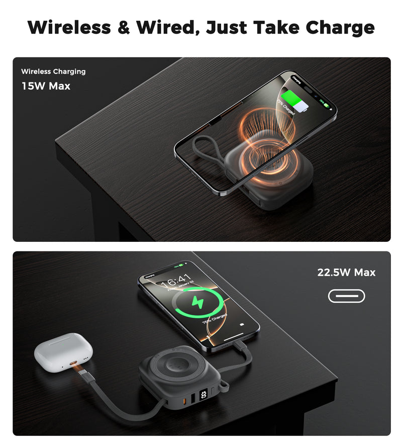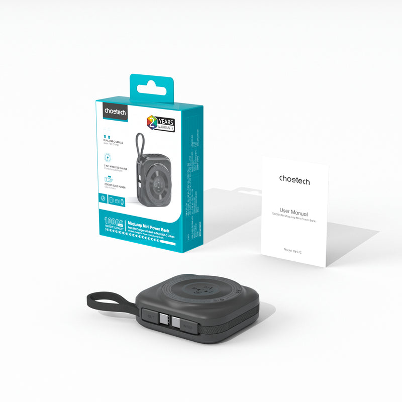Model: B697C Material: ABS Interface: Type-C+USB-A port; type-c+C cable Battery: 10000mAh*2/4.35V; Polymer Batteries Input: Type-c: 5V/3A, 9V/2A, 12V/1.5A PD18w Output: Type-C: DC5V⎓3A 9V⎓2.22A 10V⎓2.25A (22.5W Max) USB-A: 5V/2A,10W Cable output: type-c1/c2: DC5V⎓3A 9V⎓2.22A 10V⎓2.25A (SCP) 12V⎓1.67A (PD20W/22.5W Max) Mobile magnetic output: 15W max Apple watch output: 2.5W max Material/Color V0 Anti-fire PC/white, black Certification FCC, CE, RoHS, PSE, CCC