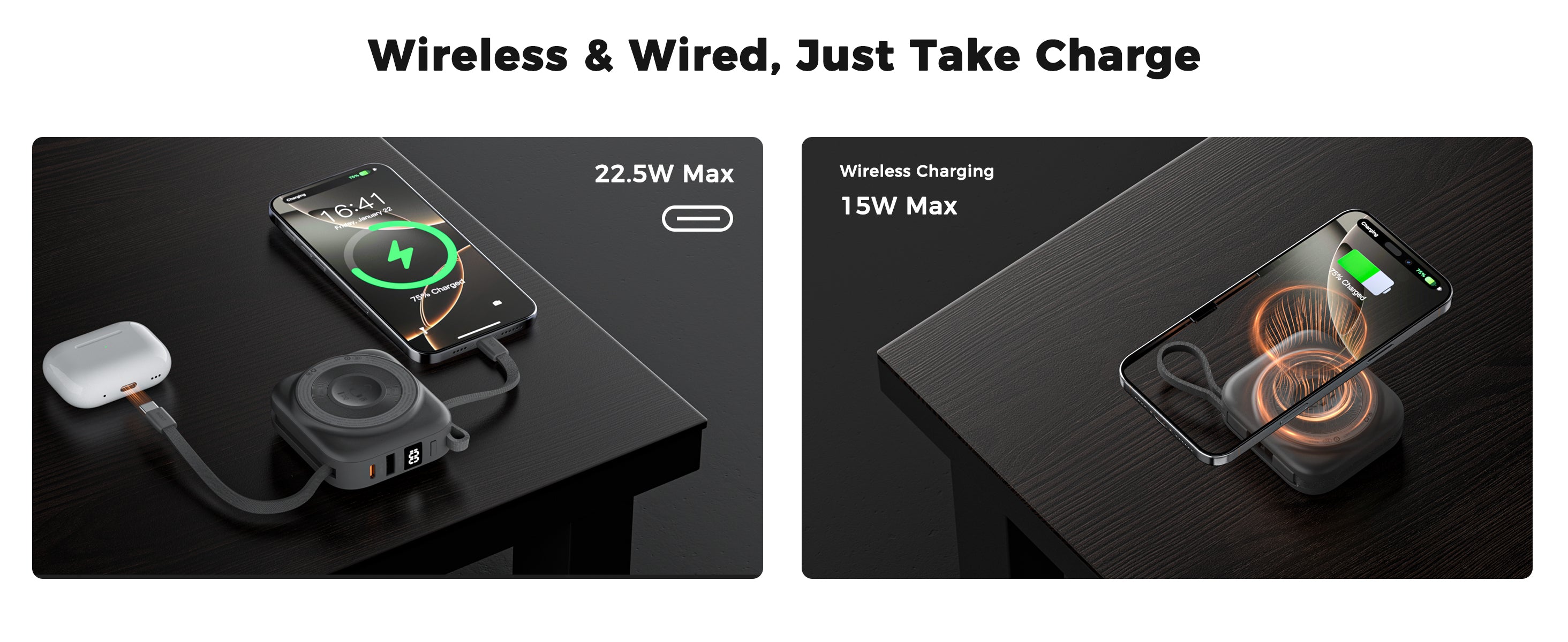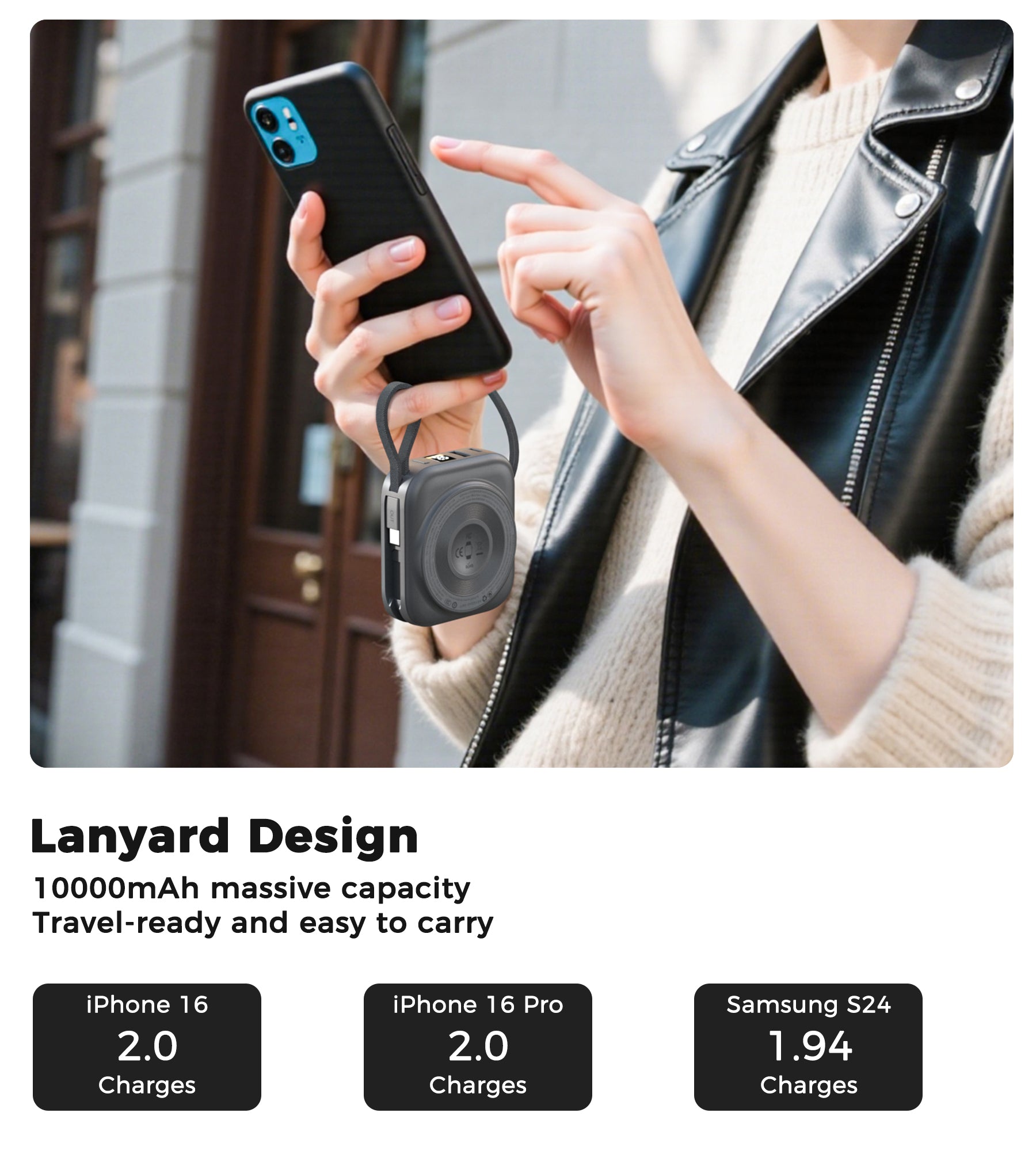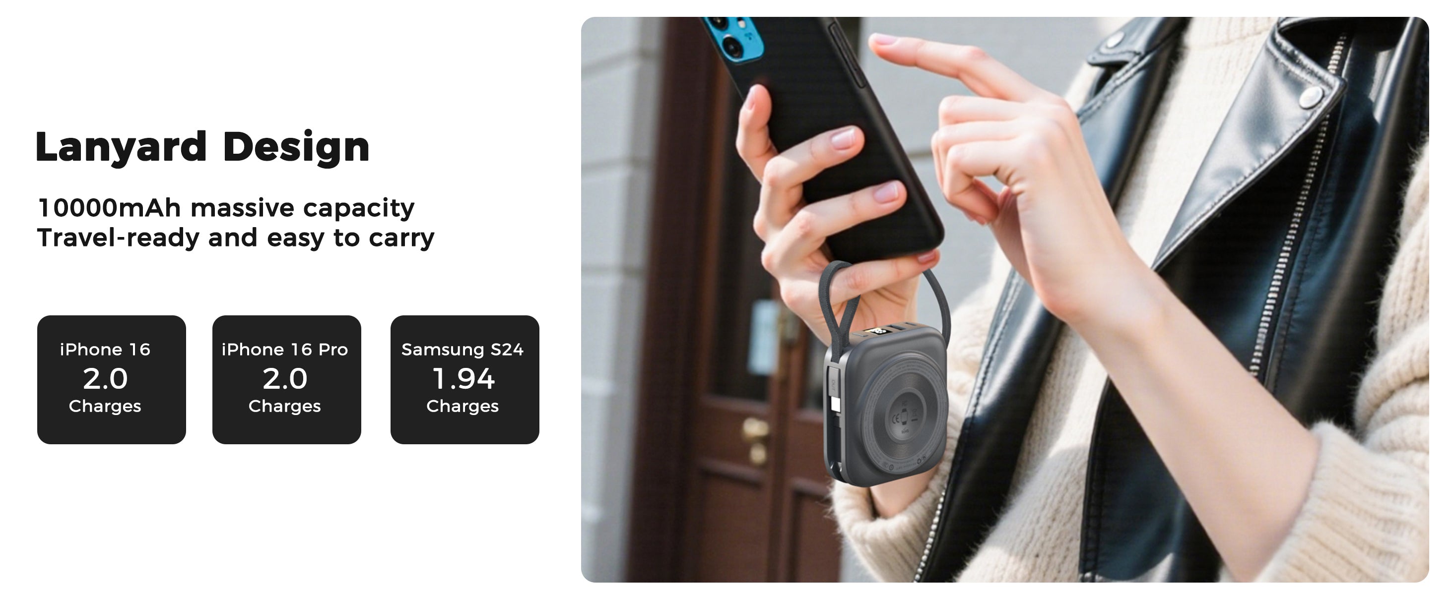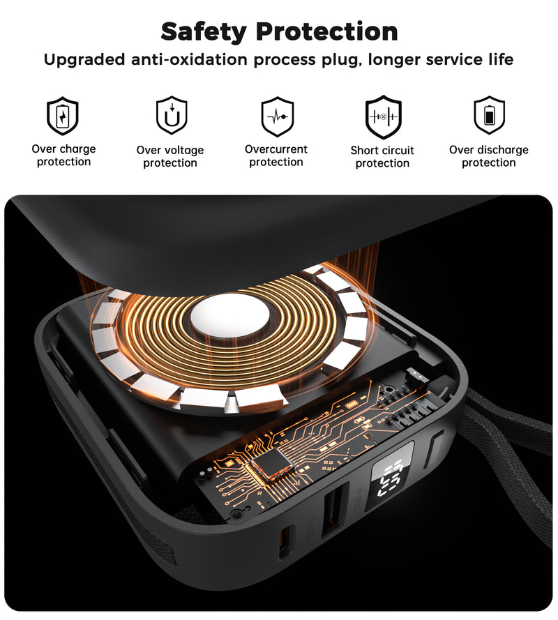 Model: B697C Material: ABS Interface: Type-C+USB-A port; type-c+C cable Battery: 10000mAh*2/4.35V; Polymer Batteries Input: Type-c: 5V/3A, 9V/2A, 12V/1.5A PD18w Output: Type-C: DC5V⎓3A 9V⎓2.22A 10V⎓2.25A (22.5W Max) USB-A: 5V/2A,10W Cable output: type-c1/c2: DC5V⎓3A 9V⎓2.22A 10V⎓2.25A (SCP) 12V⎓1.67A (PD20W/22.5W Max) Mobile magnetic output: 15W max Apple watch output: 2.5W max Material/Color V0 Anti-fire PC/white, black Certification FCC, CE, RoHS, PSE, CCC