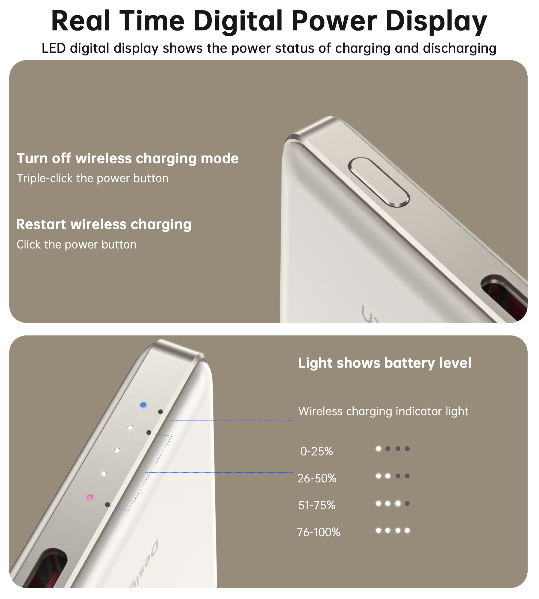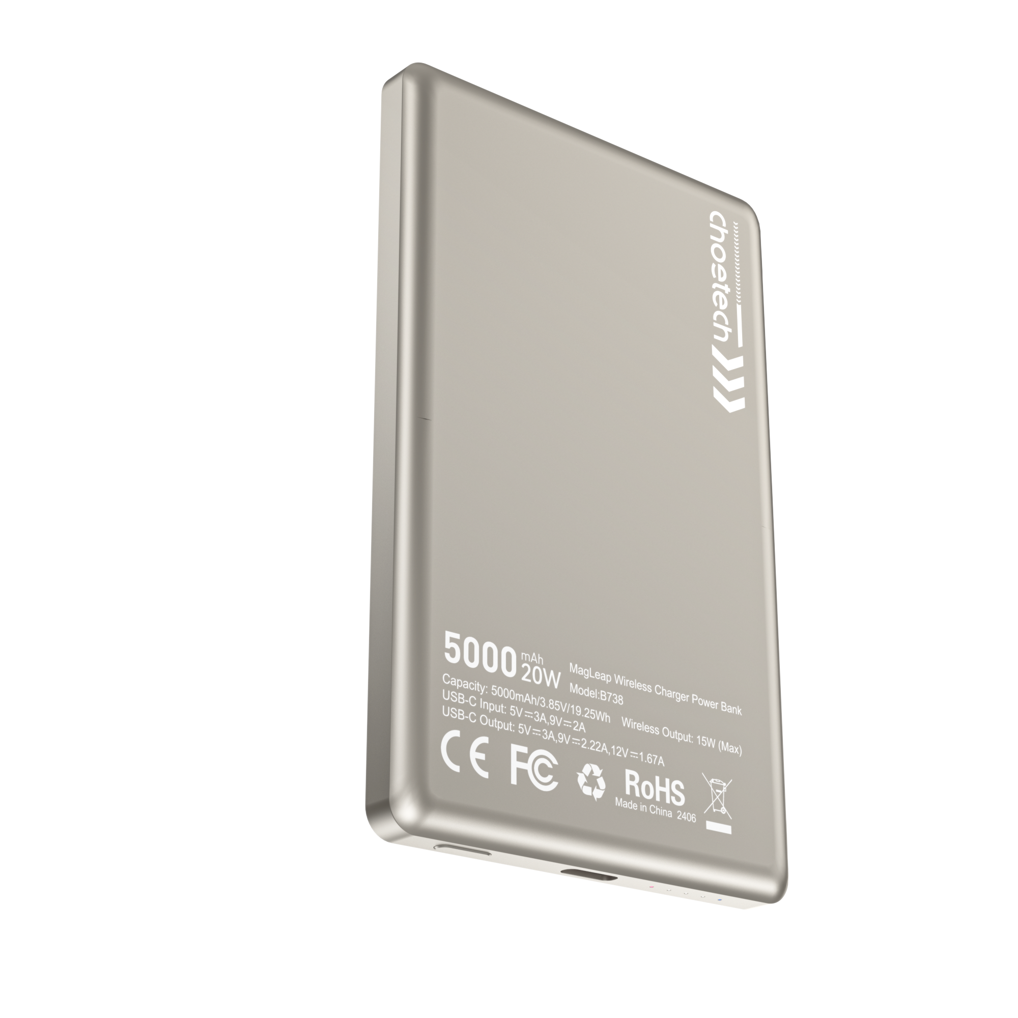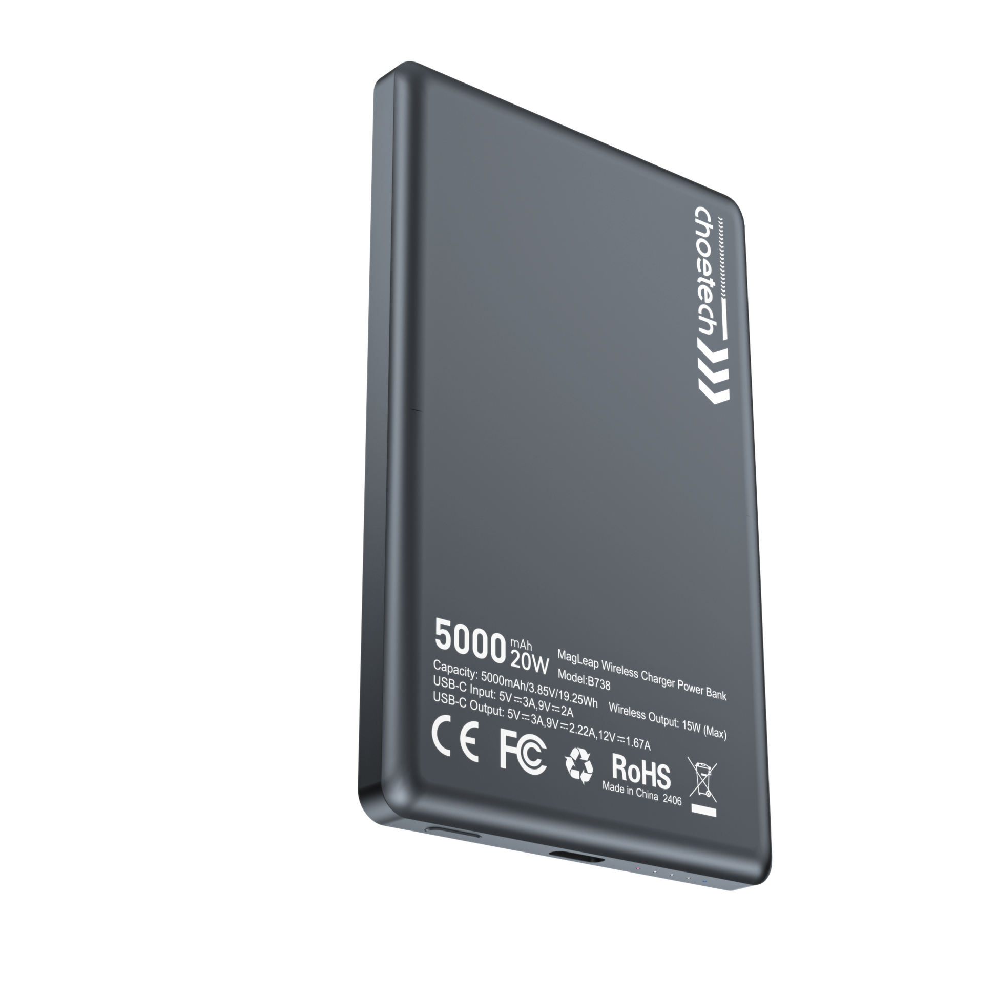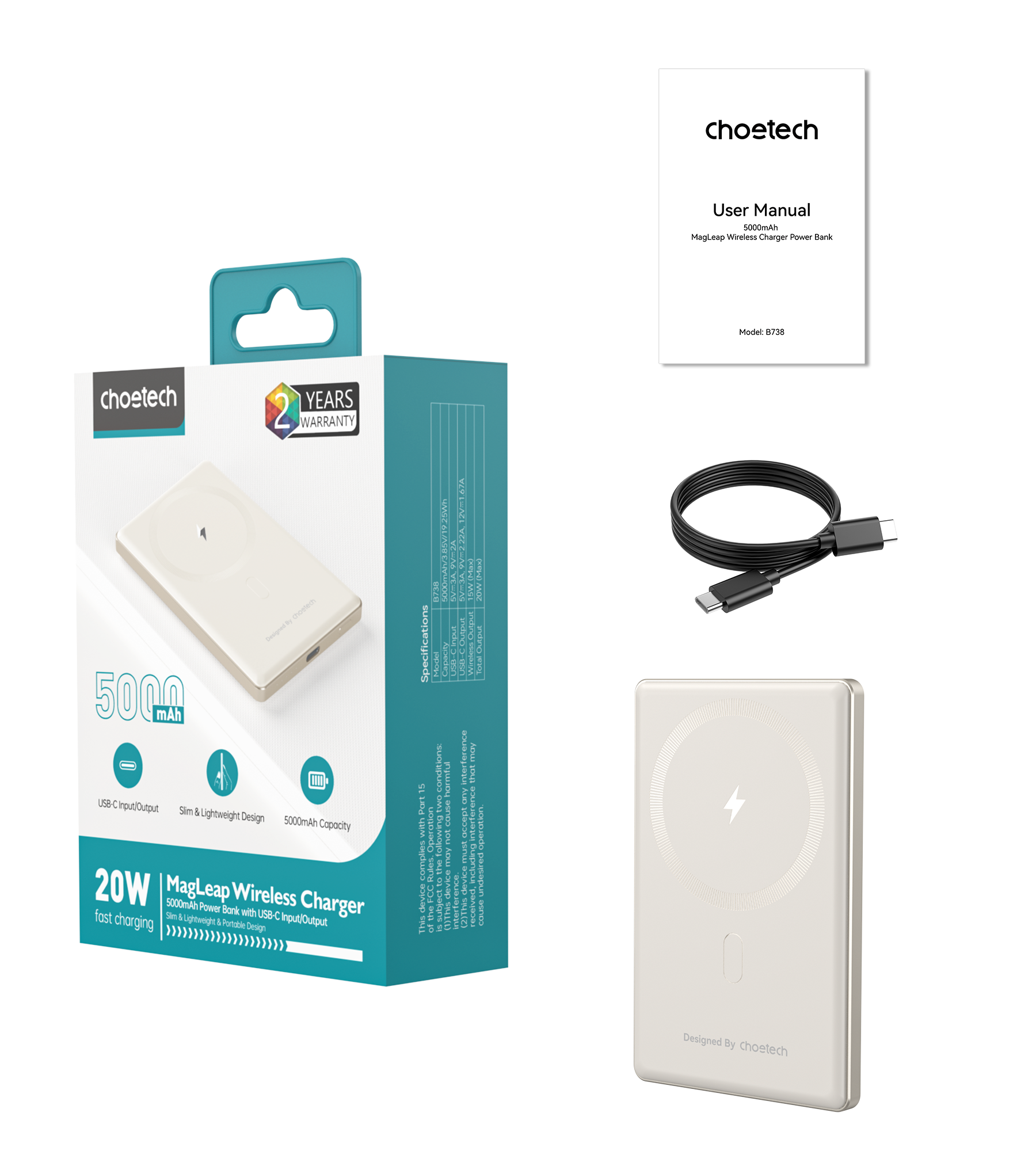Product Prameter: Model: B738 * Interface: USB-C port USB-C Input: 5V-3A/9V-2A/12V-1.5A (18W) * USB-C Output: 5V-3A/9V-2.22A/12V-1.67A (20W) *Wired maximum power: PD20W, * Wireless Output: 5V-1A/5V-1.5A/5V-2A/5V-3A (15W max) * 5 LED indicators to show left power and working status * Housing Materials: aluminium alloy * Size & N.W.: 105*66*8.9m Color: black, white Package details: power bank+ 0.3m CC cable Certification: CE, Rohs, FCC