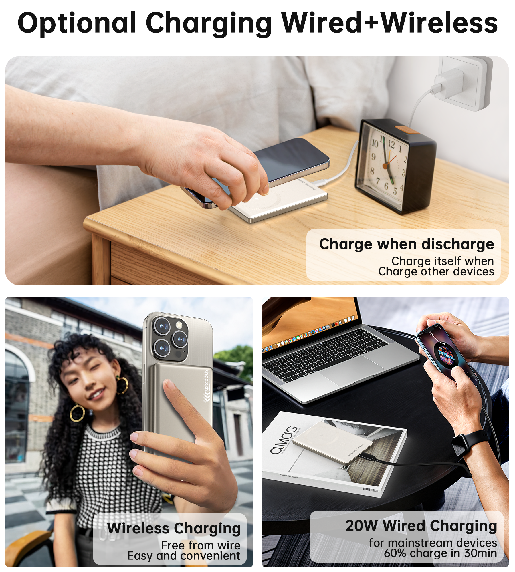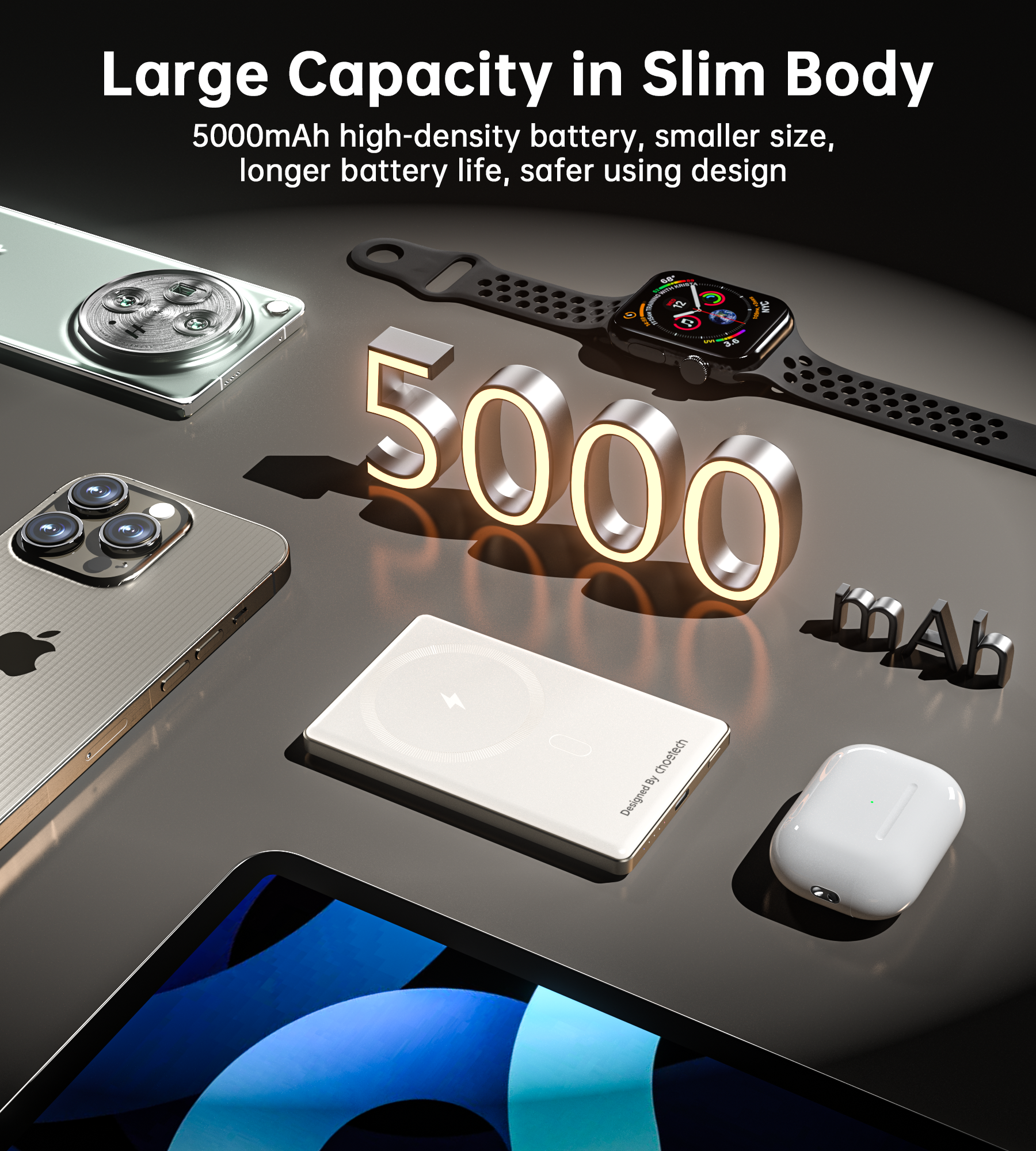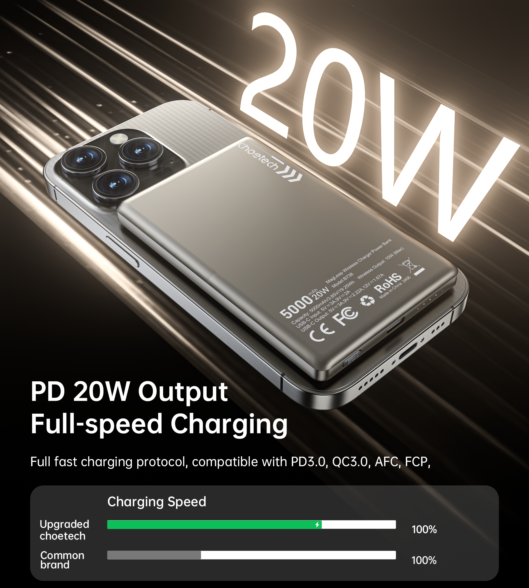 Product Prameter: Model: B738 * Interface: USB-C port USB-C Input: 5V-3A/9V-2A/12V-1.5A (18W) * USB-C Output: 5V-3A/9V-2.22A/12V-1.67A (20W) *Wired maximum power: PD20W, * Wireless Output: 5V-1A/5V-1.5A/5V-2A/5V-3A (15W max) * 5 LED indicators to show left power and working status * Housing Materials: aluminium alloy * Size & N.W.: 105*66*8.9m Color: black, white Package details: power bank+ 0.3m CC cable Certification: CE, Rohs, FCC