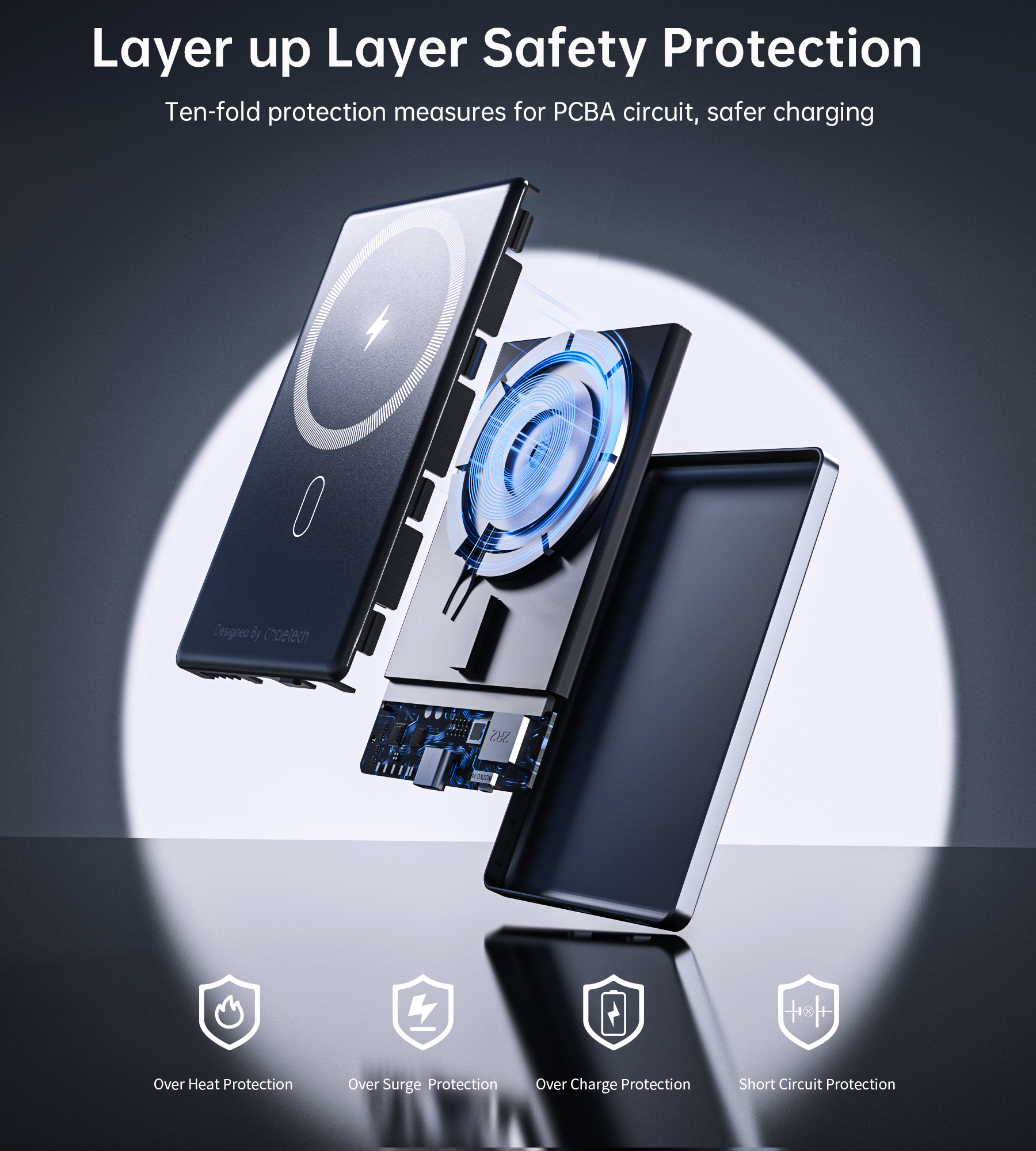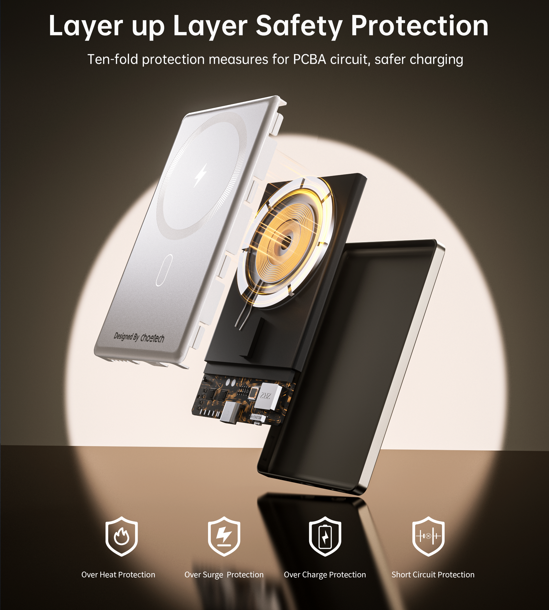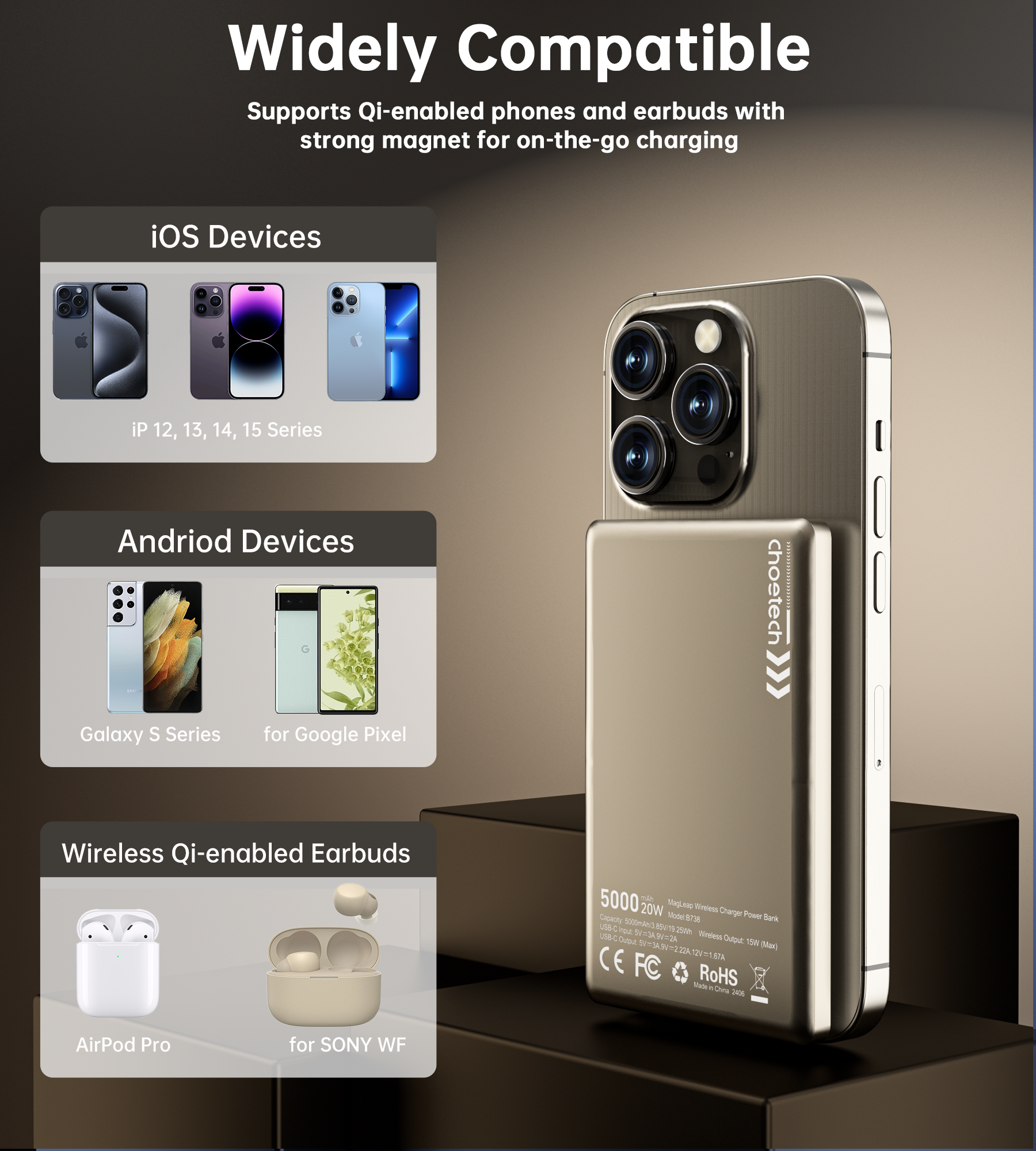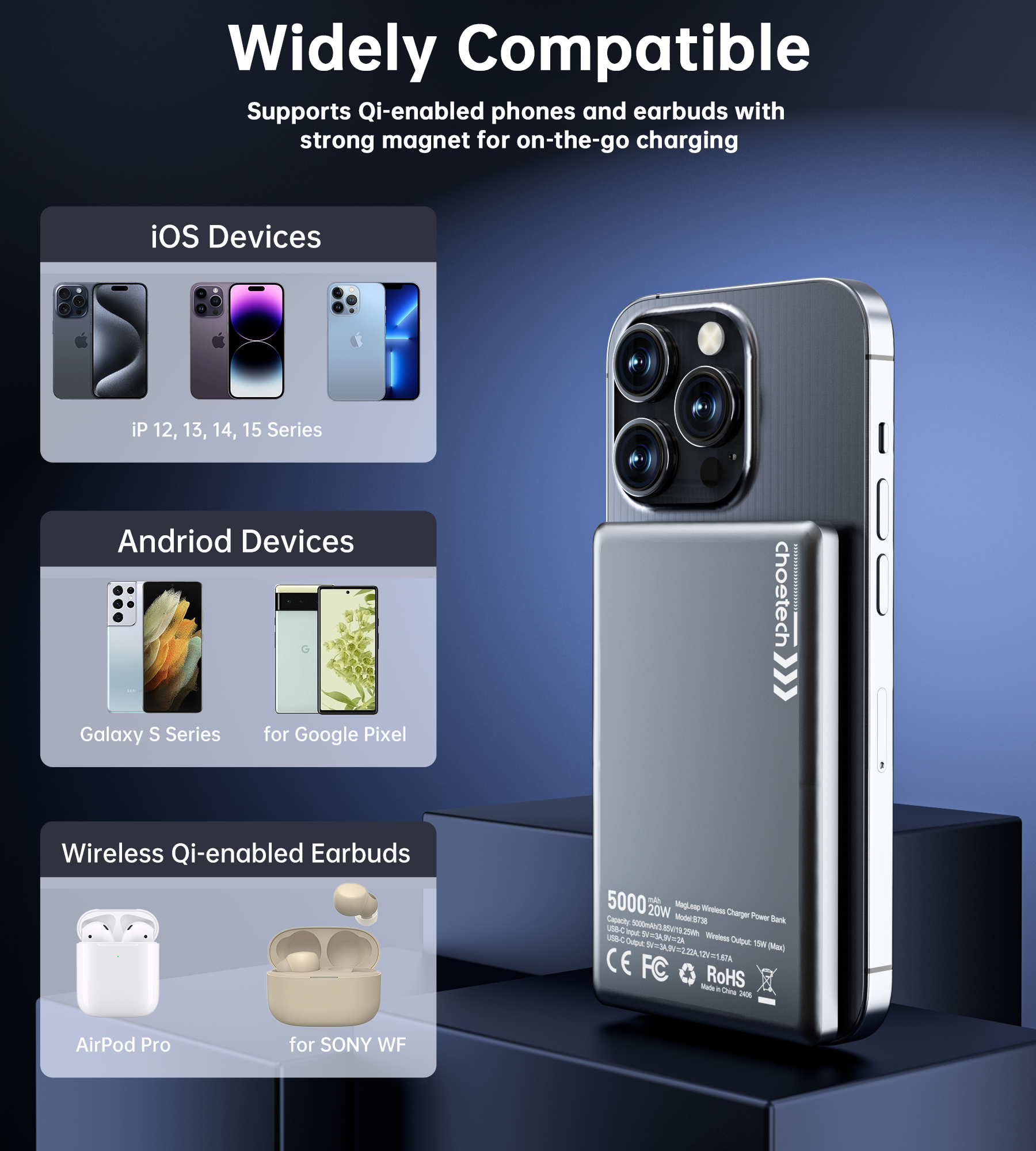 Product Prameter: Model: B738 * Interface: USB-C port USB-C Input: 5V-3A/9V-2A/12V-1.5A (18W) * USB-C Output: 5V-3A/9V-2.22A/12V-1.67A (20W) *Wired maximum power: PD20W, * Wireless Output: 5V-1A/5V-1.5A/5V-2A/5V-3A (15W max) * 5 LED indicators to show left power and working status * Housing Materials: aluminium alloy * Size & N.W.: 105*66*8.9m Color: black, white Package details: power bank+ 0.3m CC cable Certification: CE, Rohs, FCC