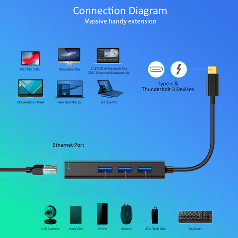 Specifically designed to complement the latest technology and smart devices with USB-C connectivity, Contain three USB3.0 ports and one RJ-45 port. like 2017/ 2016 MacBook Pro, 2016/2015 MacBook, Chromebook, and more other type-c devices. others USB-C laptops. Let you connect your laptop to other USB devices for data transfer, display expansion, and charging when you are in the office or traveling.