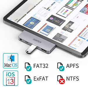 Compared with traditional USB-C hubs, this USB-C adapter for iPad Pro is highly compatible with iPad Pro-2019/2018. It supports regular flash drive USB to work in word/excel processor, also able to read video/PDF/ZIP files. Note: If you want to write the documents on the flash drive, please open them in the corresponding iPad app. Do not support NTFS.