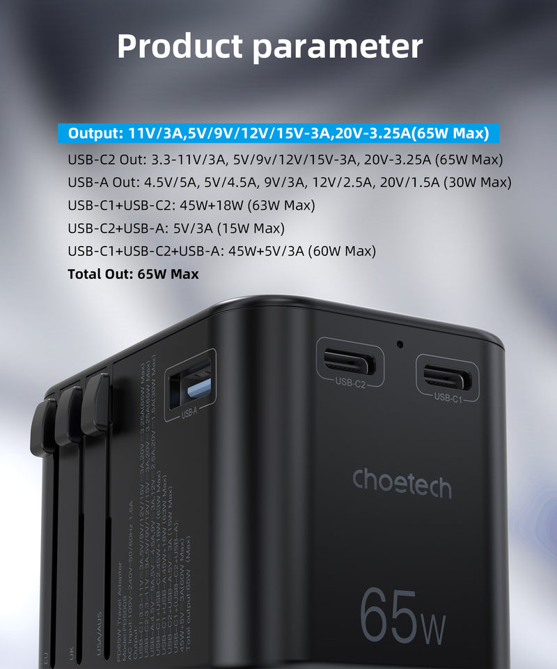 Choetech’s 65W Travel Adapter was designed to be the most convenient, useful and easy-to-use travel charger. The plugs on the travel adapter include AU, EU, UK, and US plugs - you’ll find sliders on the side to take out each plug. Note: Something pretty cool about the AU plug is that all you have to do is adjust the angle of the US plug to make it an AU plug.