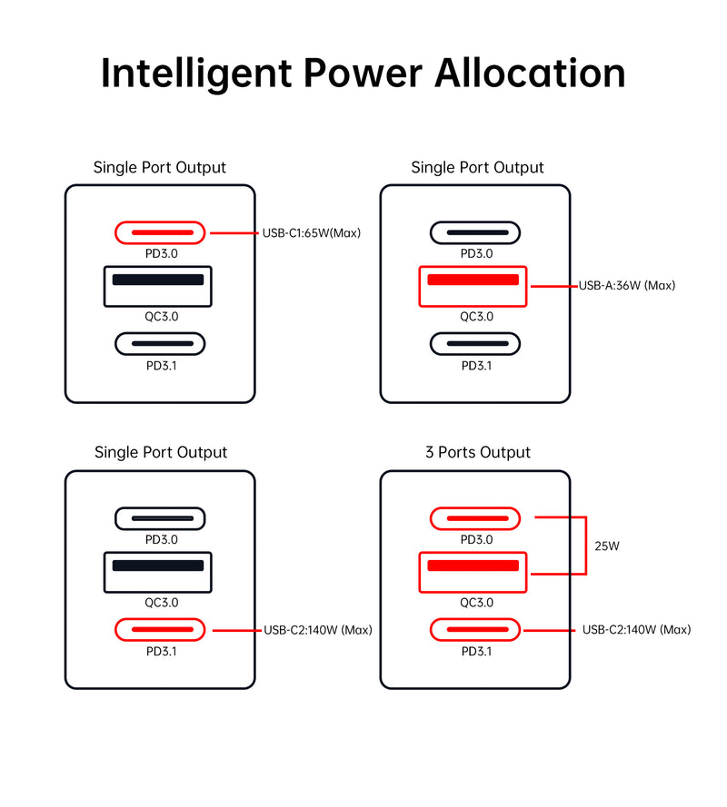 USB-C1 (PD3.1): 5V⎓3A, 9V⎓3A, 15V⎓3A, 20V⎓5A, 28V⎓5A (140W Max)