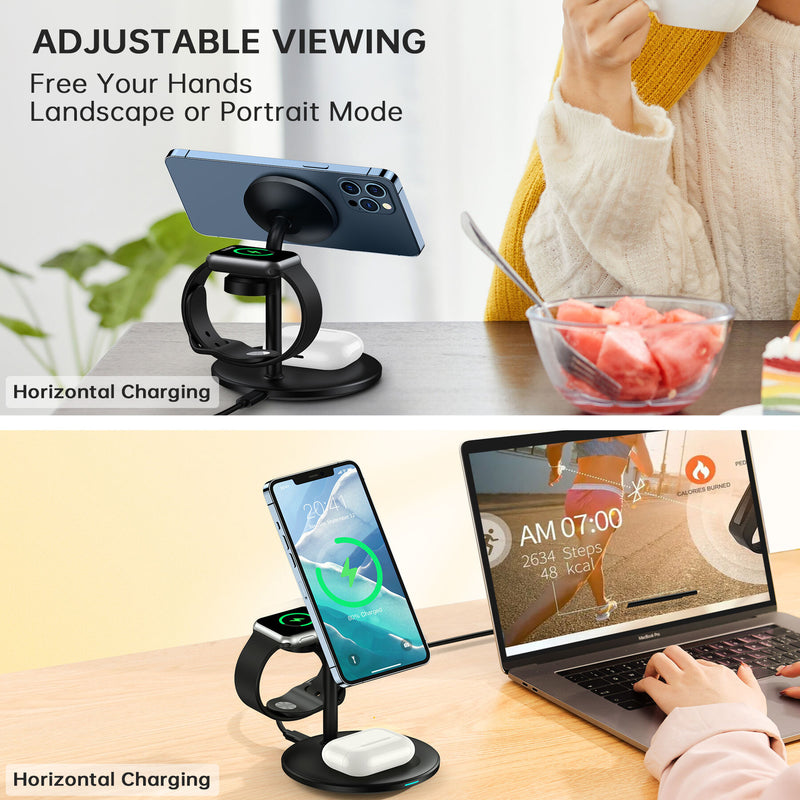 🧲 Magnetic 3-in-1 Charging: Precision magnetic array simultaneously secures and charges iPhone, Apple Watch, and AirPods. Features a 30° adjustable stand for comfortable viewing while charging.