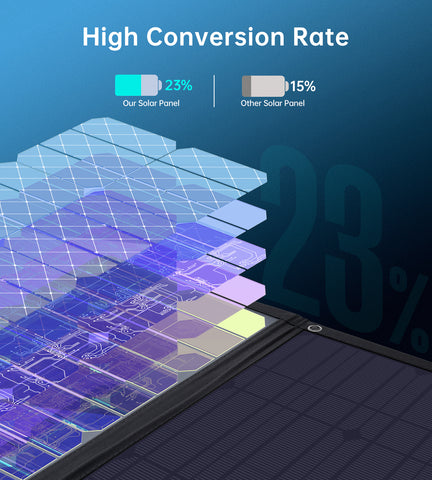 High-efficiency solar panels arrays that could offer a conversion of up to 21-23.5%. The solar panel portable charger makes the most use of the sun and convert the sunlight into clean energy.