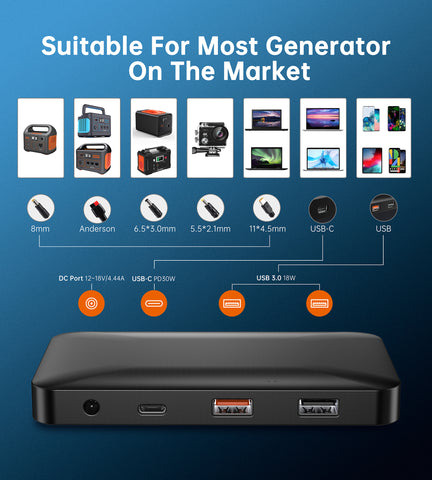 Compatible with most solar generators on the market with DC connections such as Jackery, Chafon, Suaoki, Goal Zero Yeti, Webetop, Paxcess and ROCKPALS and offers grid-independent green power solutions.